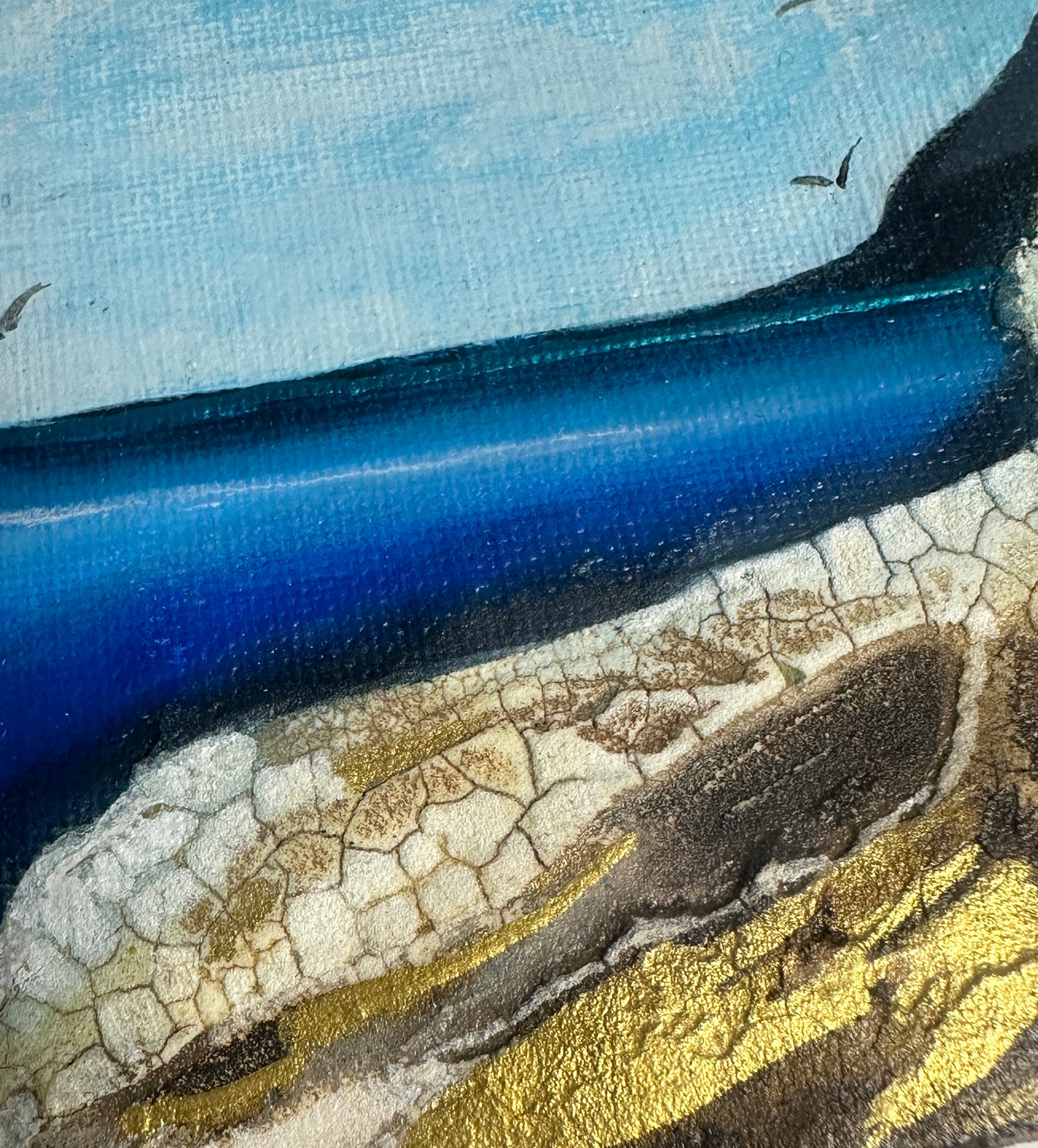Seascapes and landscapes, your perfect little textured minis, vibrant colours and metallic golds make this little works of art shout loudly.