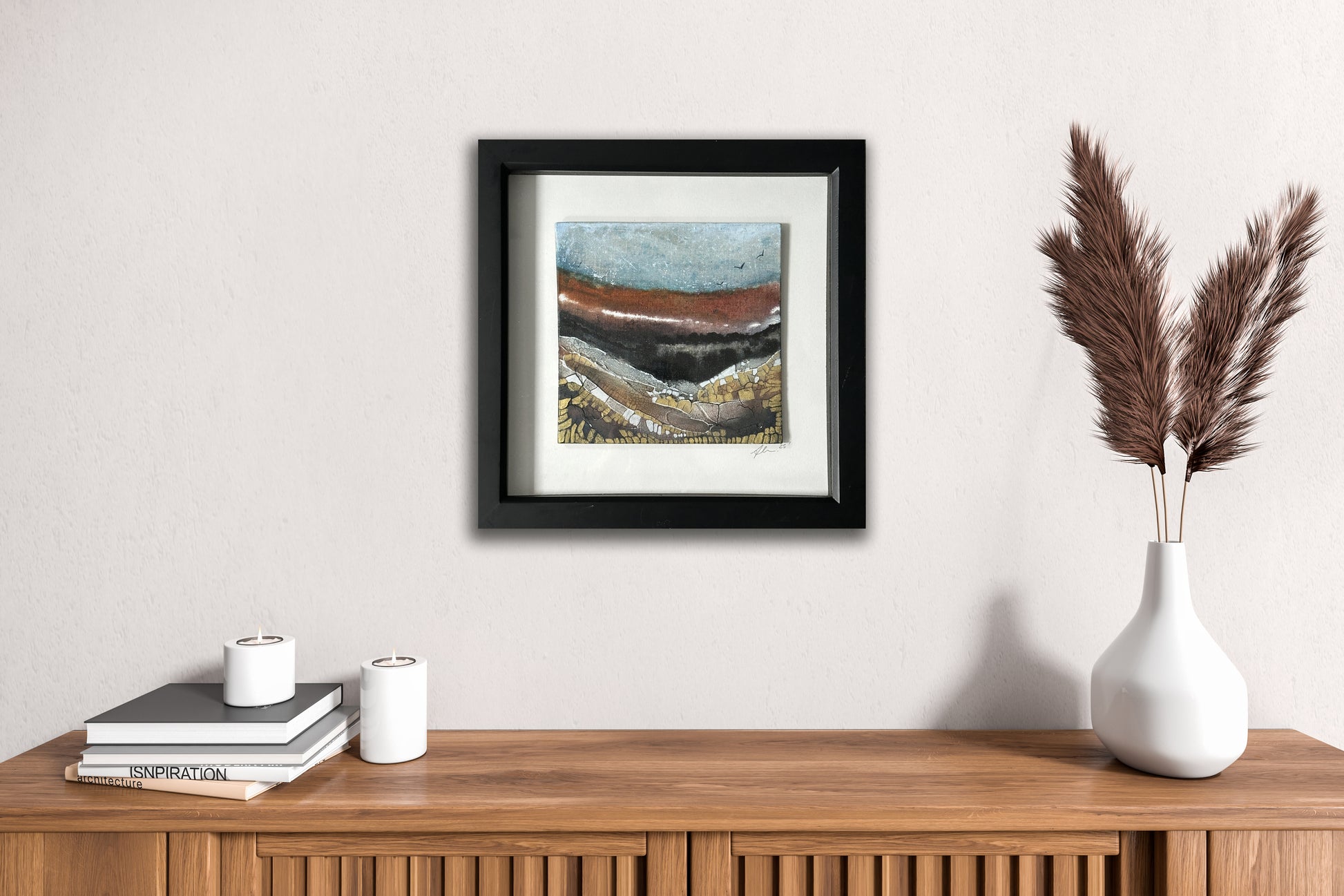 Textured Art, mixed media, mounted on card and signed. Framed in a black box frame with glass covering.