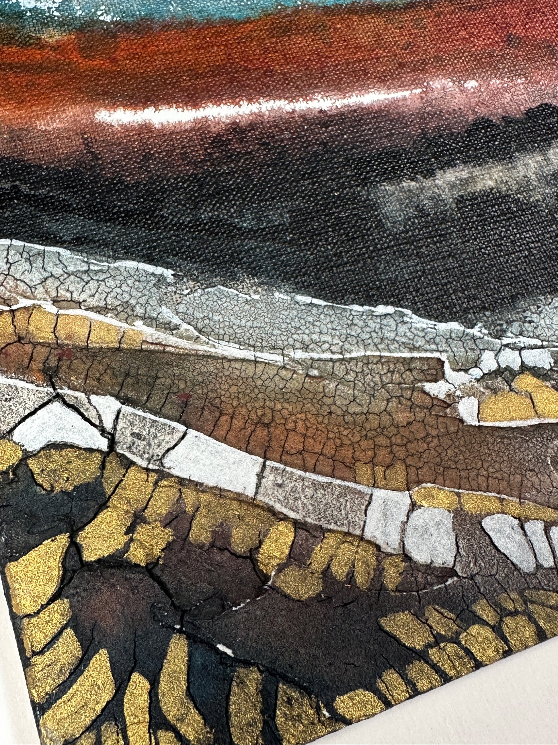 Original hand-painted on a canvas board, landscape, made with acrylic inks and paint, textured paste. Finished with satin varnish and ready to hang. This is a one-off painting.