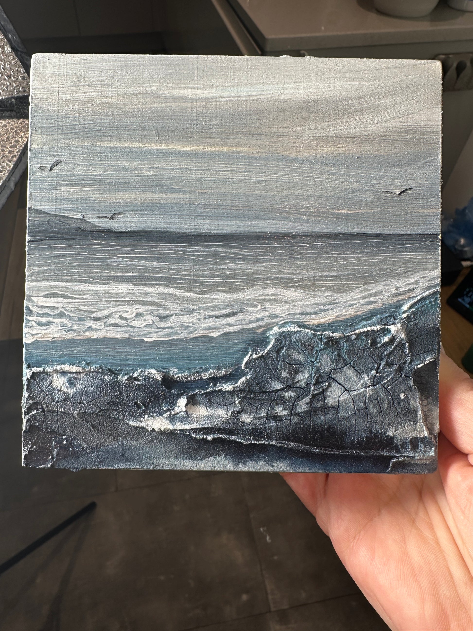 This is a mini original artwork called 'Snow Water'. Its one of a series of 6 which I completed in November. Made with mixed media, inks, paint and paste. Inspired by my many trips to beaches in the UK and abroad. 13x13cm (5x5inches)on wooden board.